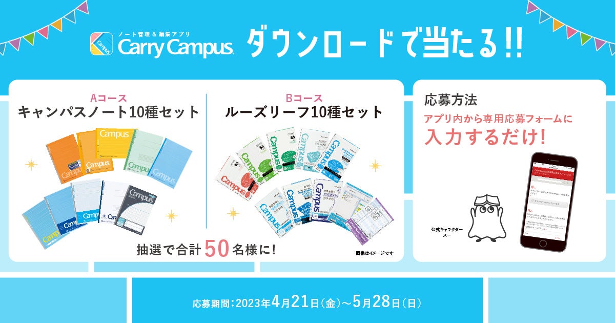 Carry Campusを新規ダウンロードし、アプリ内から専用応募フォームにアクセスして応募できます。抽選で「キャンパスノート10種セット」または「ルーズリーフ10種セット」が合計50名様に当たります。