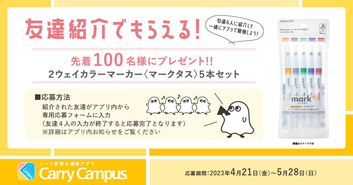 まだCarry Campusを利用したことのない友達4人を招待いただいた方、先着100名様に「2ウェイカラーマーカー〈マークタス〉5本セット」をプレゼントします。