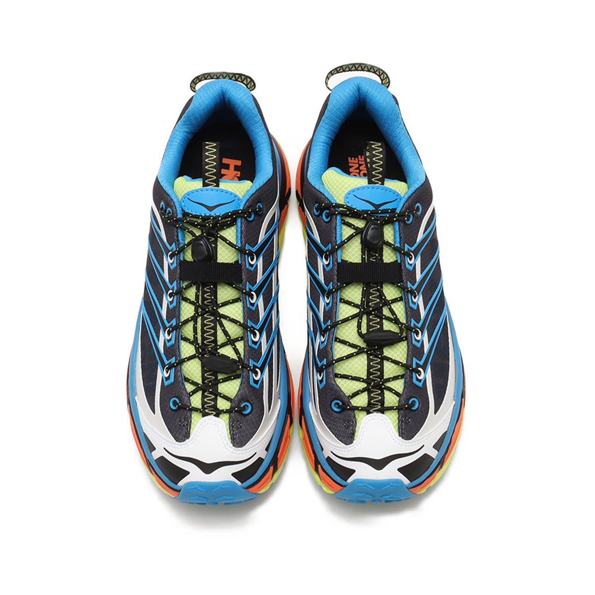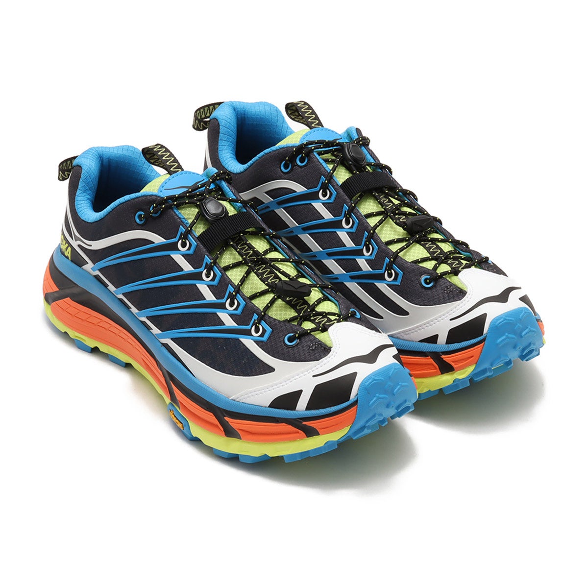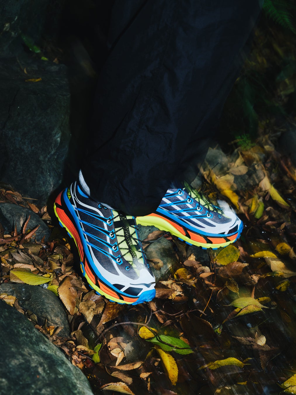 最後は、レトロな佇まいが新鮮に映るMAFATE THREE2がラインナップ。トレイルランニングタイプのMAFATE SPEED 2のシルエットを活かしながら大胆なロゴを配したデザインが特徴的なHOKAのアーカイブモデルMAFATE 3のアッパーを組み込んだマッシュアップなモデル。また、マチ付きで可動域が多いシュータンとフィット感を調節できるクイックレースシステムを搭載して履きやすさにも配慮し、アウトソールは耐久性に優れたVibramソールを採用。「HOKA」らしさを詰め込んだハイテク顔な一足です。