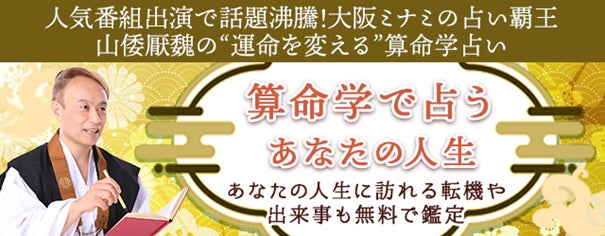 大阪ミナミの占い覇王として数々の番組やメディアで人気を博している山倭厭魏(やまとおうぎ)による本格算命学サイト『山倭厭魏の算命学』にて、この度『算命学で占う人生占い』を無料公開いたしました。生年月日を入力するだけで、あなたの運命の結婚相手の特徴や出会いの時期、入籍日まで詳細に鑑定することができます。