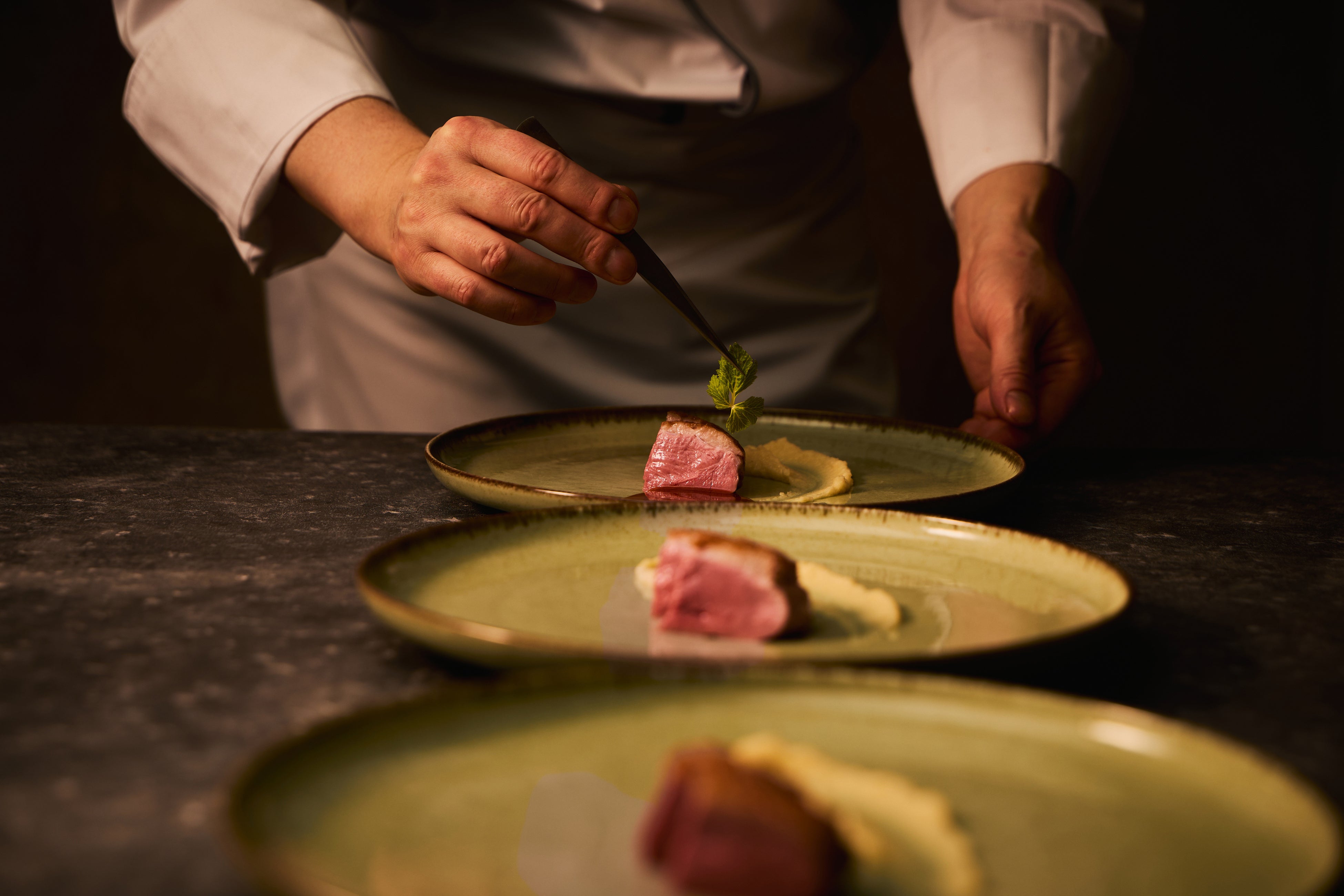 ディナー:和牛ステーキ、和牛炙り肉寿司、京都産ポークの黒酢酢豚、合鴨ロース ステーキ、ポルチーニラーメン など全9品