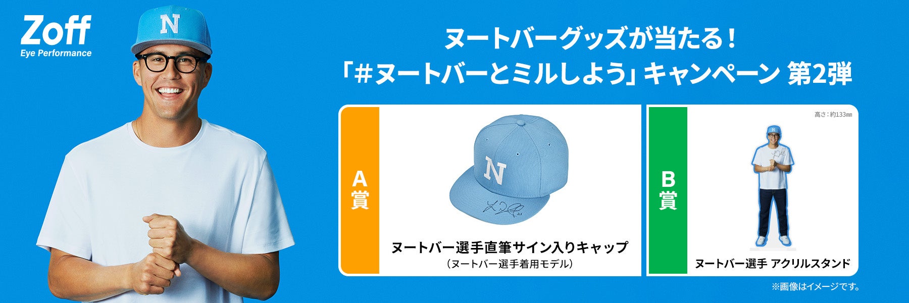 「#ヌートバーとミルしよう 第2弾」は、Zoff公式Xアカウント(@Zoff_INFO)をフォローし、希望の賞品を本文に入れて引用リポストすると、「ヌートバー選手直筆サイン入りキャップ(ヌートバー着用モデル)」が5名、「ヌートバー選手アクリルスタンド」が300名に抽選で当たるプレゼントキャンペーンです。ここでしか手に入らないヌートバー選手グッズを当てて、一緒に”ミル(見る)”を楽しみましょう。