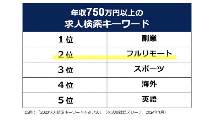 年収750万円以上、2023年の求人検索キーワードの2位に「フルリモート」がランクイン