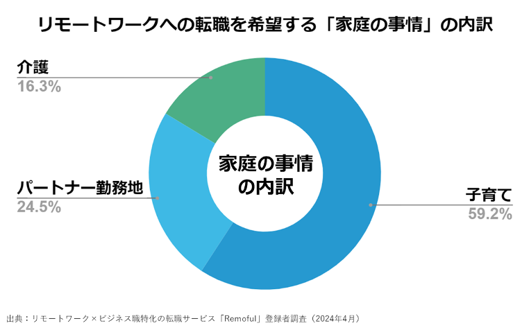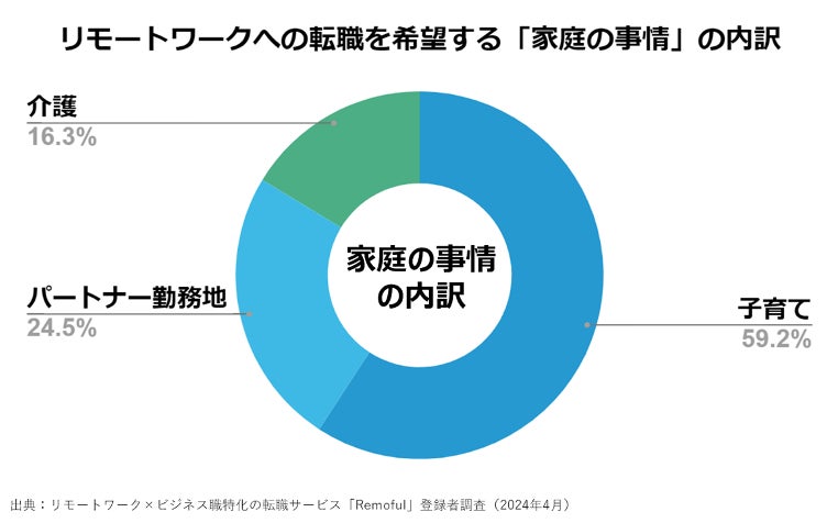 リモートワークのビジネス職への転職を求める「家庭の事情」の内訳において、「子育て」が最多の59.2%。次に「パートナーの勤務地」が24.5%、「介護移住」が16.3%となりました。