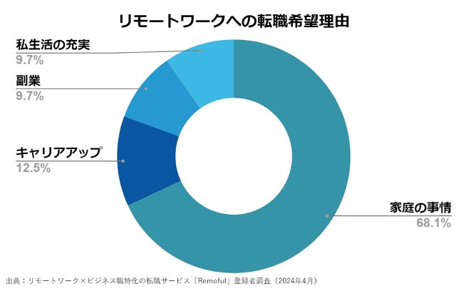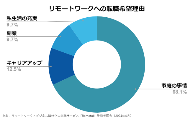 エンジニア職に比較すると、依然として普及が進んでいないビジネス職正社員のリモートワーク。そのリモートワーク×ビジネス職×正社員の転職支援に特化する「Remoful」にて、キャリアアドバイザーを通じた転職希望者へのヒアリング調査を行いました。調査の結果、リモートワークへの転職希望理由において、最多の68%を占めたのが「家庭の事情」でした。そして、次に「キャリアアップ」が12.5%、「副業」、「私生活の充実」が9.7%となりました。