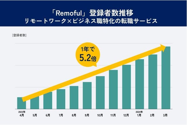 リモートワークOKなビジネス系職種の求人に特化したRemofulの登録求職者数は、2023年4月から2024年3月の1年で5倍となっています。