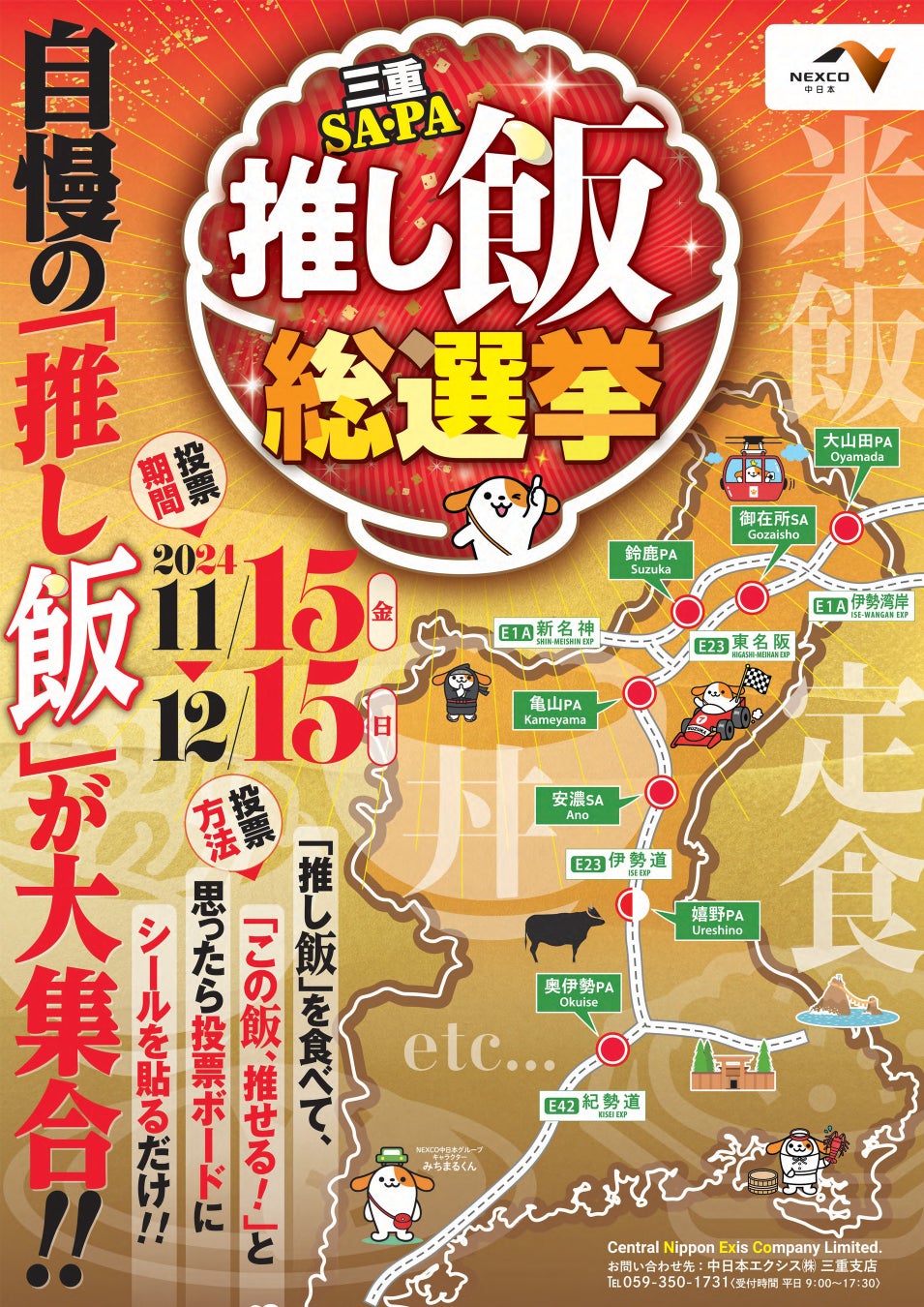 中日本エクシス株式会社 三重支店(三重県四日市市鵜の森、支店長・山本(やまもと)武司(たけし))は、三重県内のサービスエリア(SA)パーキングエリア(PA)の店舗(一部除く)において、前回、好評であった「推し」企画を開催します。今回は秋の行楽シーズンに合わせ、「飯」を選出した“三重県SA・PA推し飯総選挙”を開催します。