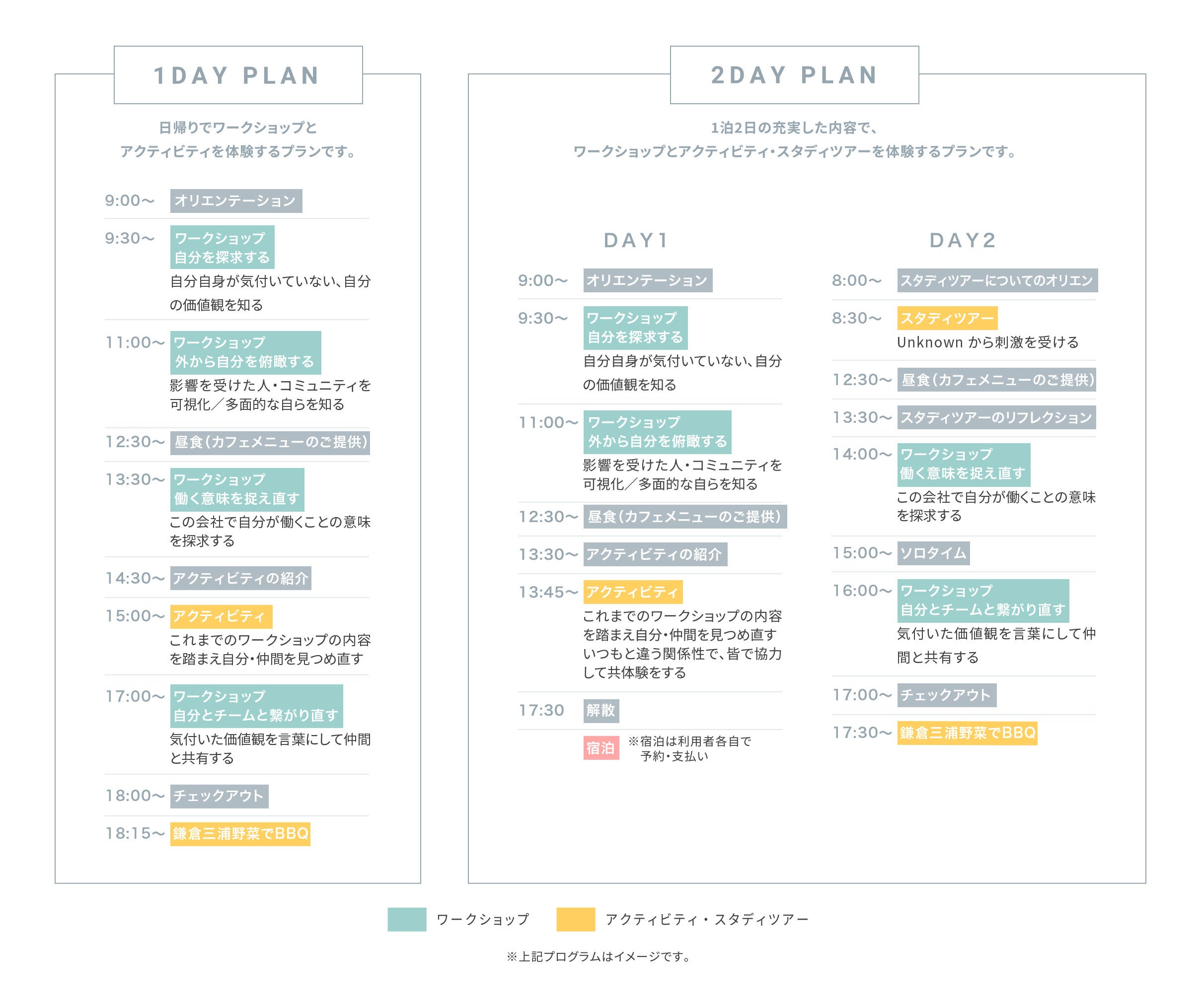 本プログラムは、鎌倉という都心からのアクセスがよく、かつ豊かな自然や文化に囲まれた心を開ける環境の中で、社員が集まって実施するワークショップ形式のチームビルディングプログラムです。「会社」ではなく「自分」を起点に、大切にしていることや仕事・社会との関わり方といった自身の価値観・欲求と向き合い、仲間同士でシェアし、フィードバックし合う。自分・他者への理解を深めた先に、主体的に自分と仲間、自分と会社、自分と社会との関係性を結び直していきます。また、ワークショップの合間に、鎌倉の地を生かしたアクティビティやステディツアーを盛り込み、身体を動かしながらリフレクションを行ったり、地域に根付いたコミュニティから新たな発見を得たりすることで、自分・同僚・会社についてあらためて理解を深めながらクリエイティブなチーム力を高め、個と組織の同時成長を実現します。