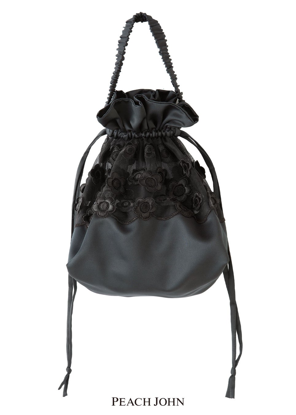 透け感のあるデイジーモチーフのレースとサテンを使用した、トレンド感のある巾着型ランジェリーポーチ。
