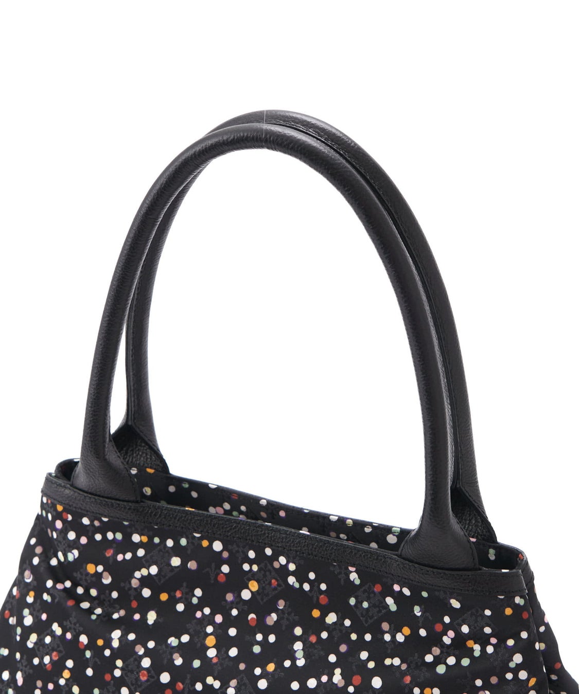 モノグラム柄のナイロンジャガードに、多色使いしたあられドットをプリントしています。