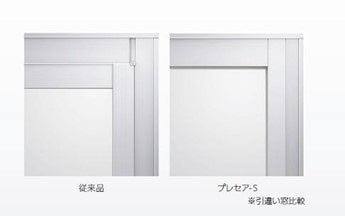 また、召合せかまちの先端部を5mm小さくし、ゆるやかに細くすることで、よりスリムさを際立てています。このように既存のガラス溝幅36㎜のデザイン性はそのままに高性能化を実現させたため、建物の中高層階から超高層階の必要強度に応じて「PRESEA-S」を使い分けても、外観は統一したデザインにすることが可能になります。(引違い窓・片引き窓の場合)