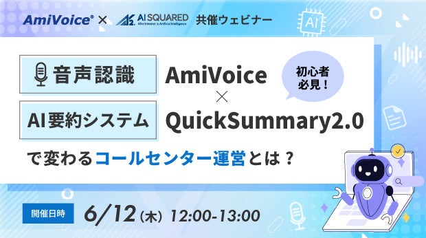 2025年6月12日(木)、株式会社アドバンスト・メディア(本社:東京都豊島区、代表取締役会長兼社長:鈴木清幸 以下、アドバンスト・メディア)は、アドバンストメディア×エーアイスクエア社オンラインセミナー「【初心者必見】音声認識AmiVoice×生成AI要約 QuickSummary2.0で変わるコールセンター運営とは?」を共催いたします。
