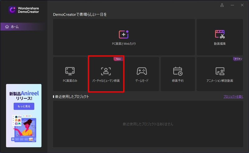 ●STEP1:DemoCreatorを起動し、スタートページで「バーチャルヒューマン録画」モードを選択します。