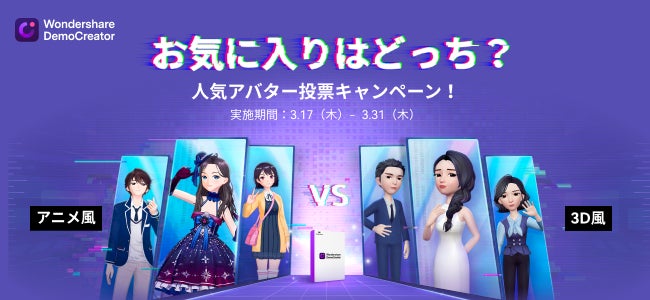 世界150か国以上で利用されるソフトウェアを手掛ける、株式会社ワンダーシェアーソフトウェア(東京都千代田区、代表:呉太兵)は、誰でも簡単に使える画面録画・動画編集ソフトWondershare DemoCreator(ワンダーシェアー デモクリエイター)が、2022年3月17日(木)~2022年3月31日(木)まで、Windows版の新機能「バーチャルヒューマン録画」の実装を記念して「お気に入りはどっち?期間限定投票キャンペーン」を実施いたします。