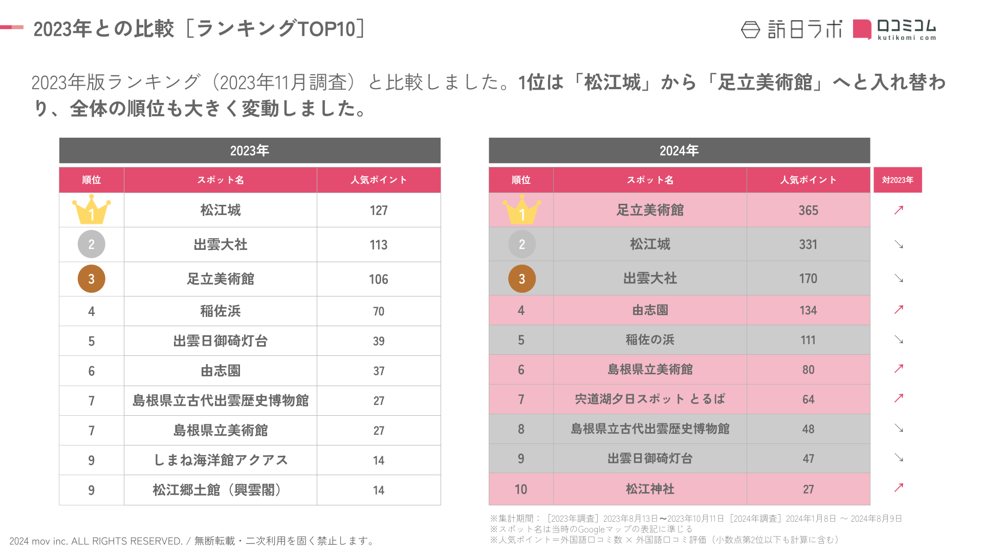 1位は「松江城」から「足立美術館」へと入れ替わり、全体の順位も大きく変動しました。