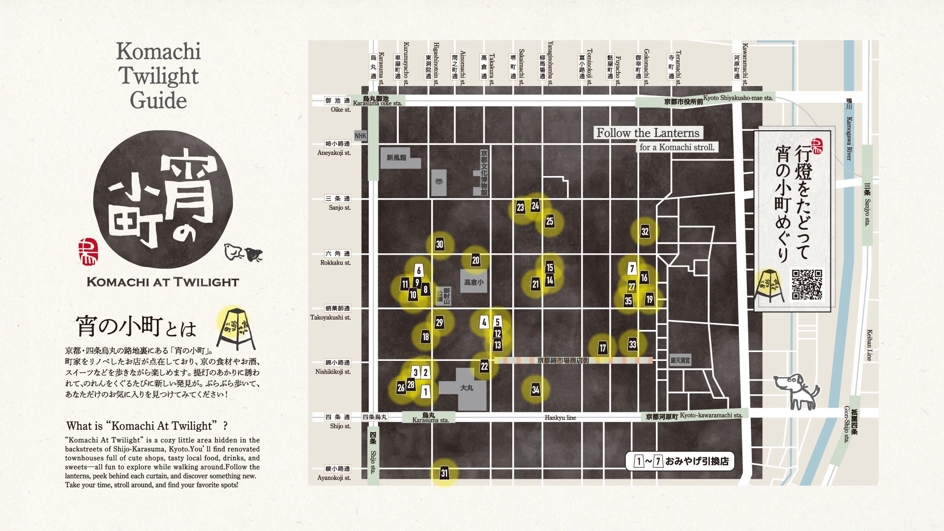 A Hidden Kyoto Quarter(京都の隠れた地区) 京都・烏丸駅北東エリアに点在する京町家を再生し、飲食・物販・文化体験を融合した新しい街歩きエリア。昼はカフェやギャラリー巡り、夜は京町家での食体験など、昼と夜の京都を散策できる新しい回遊スポット。目印は行燈。