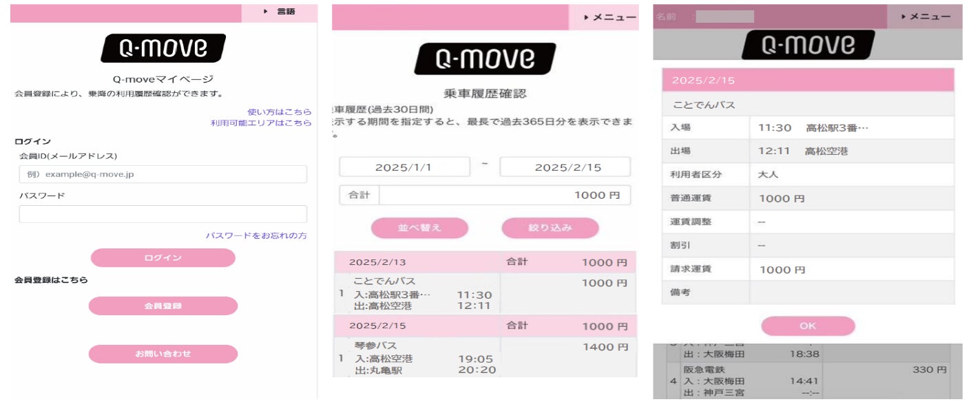 QUADRACのQ-moveサイト(https://q-move.info/)にアクセスし、マイページの会員登録手続きが完了しますと確認可能です。
