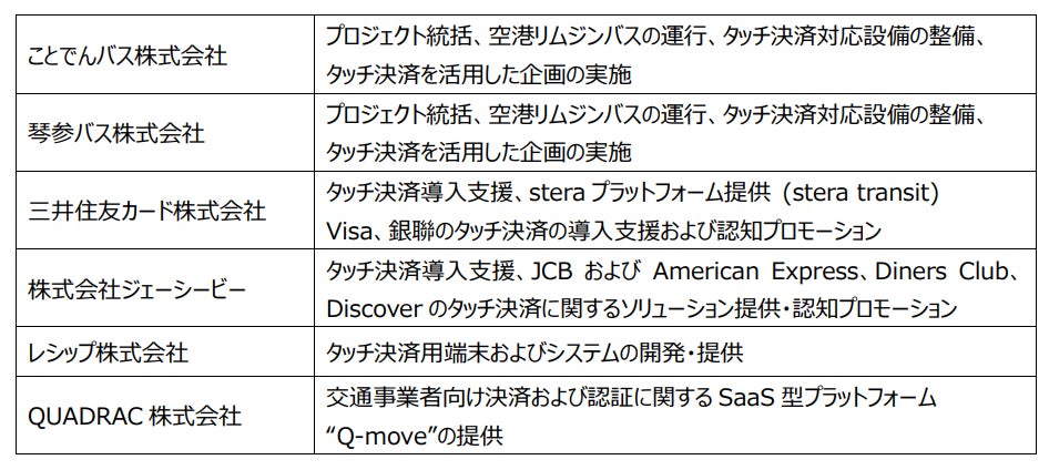 ことでんバス株式会社(本社:香川県高松市、代表取締役社長:石川 雅章)、琴参バス株式会社(本社:香川県丸亀市、代表取締役社長:佐藤 邦明)、三井住友カード株式会社(本社:東京都江東区、代表取締役社長:大西 幸彦)、株式会社ジェーシービー(本社:東京都港区、代表取締役兼執行役員社長:二重 孝好)、レシップ株式会社(本社:岐阜県本巣市、代表取締役社長:杉本 眞)、QUADRAC株式会社(本社:東京都港区、代表取締役社長:高田 昌幸)、は2025年2月18日より、香川県高松市内方面および丸亀・坂出方面と空港を結ぶ「高松空港リムジンバス」において三井住友カードが提供する公共交通機関向けソリューション「stera transit」を活用した、タッチ決済対応のカード(クレジット、デビット、プリペイド)や、カードが設定されたスマートフォン等による乗車サービスを開始いたします。