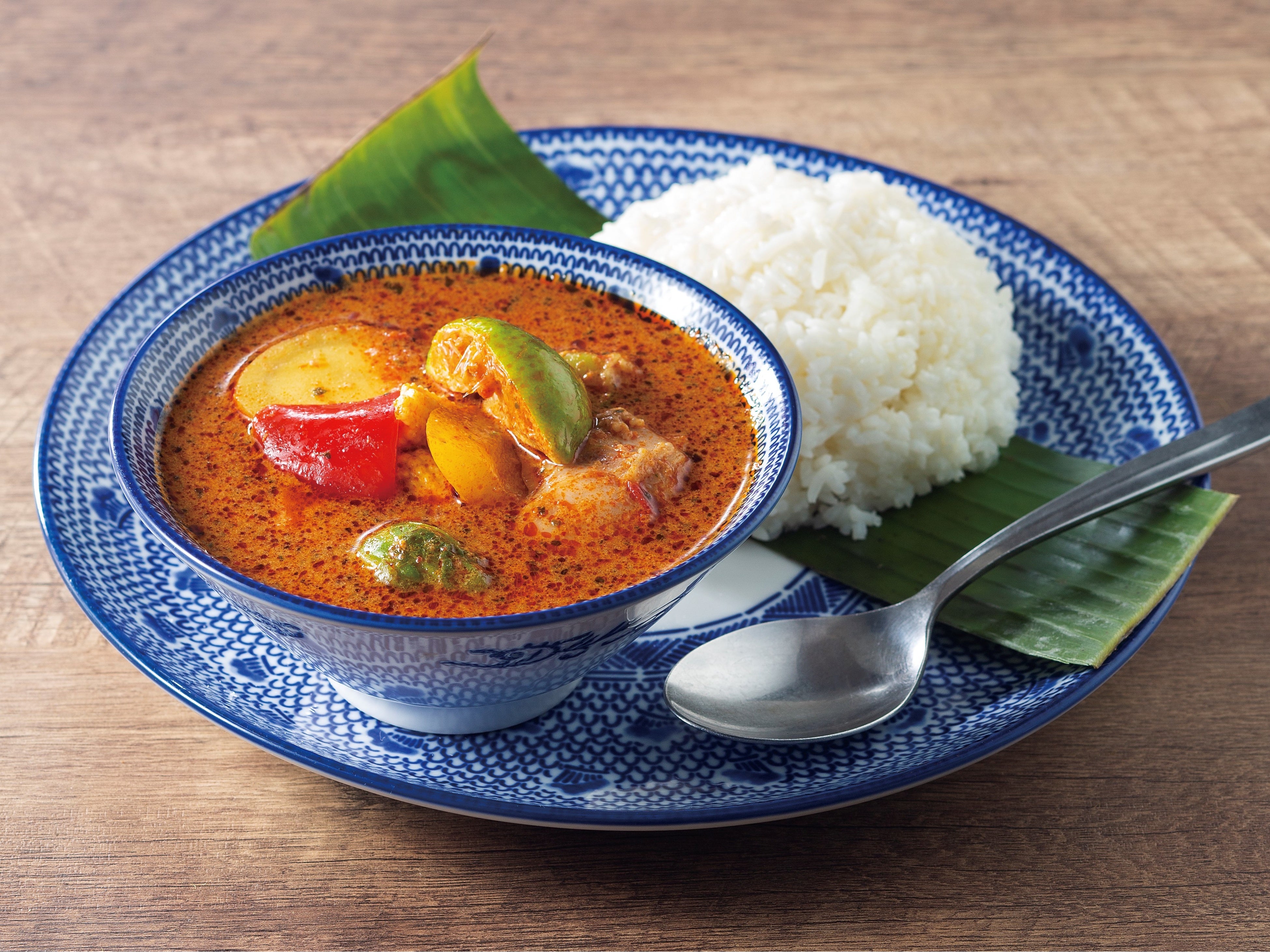 チキンやジャガイモ、芽キャベツやパプリカなどごろっと野菜が入って食べ応えも十分、タイ産ジャスミンライスとともにお召し上がりください。