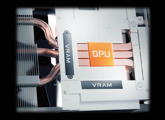 GPUやVRAMと直接接触する大型の銅板は、複合ヒートパイプを組み合わせ、内部コアから発生した熱を効率よくヒートシンクに伝えます。