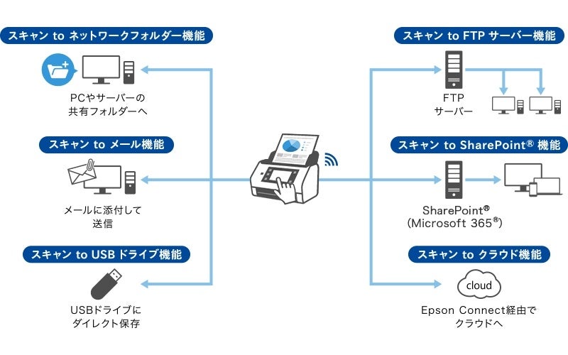 『DS-900WN』は1分間に70枚/140面(注1)の高速スキャンを実現。さらに、PCを使用せずにスキャナー本体のパネル操作のみで、スキャンデータを送信、共有できる機能を標準搭載しました。オプションで、「エプソンのスマートチャージ」対応の複合機などと共通の認証機能にも対応し、お客様の業務ニーズに合わせて複合機とスキャナーを組み合わせた最適な電子化環境を構築いただけます。