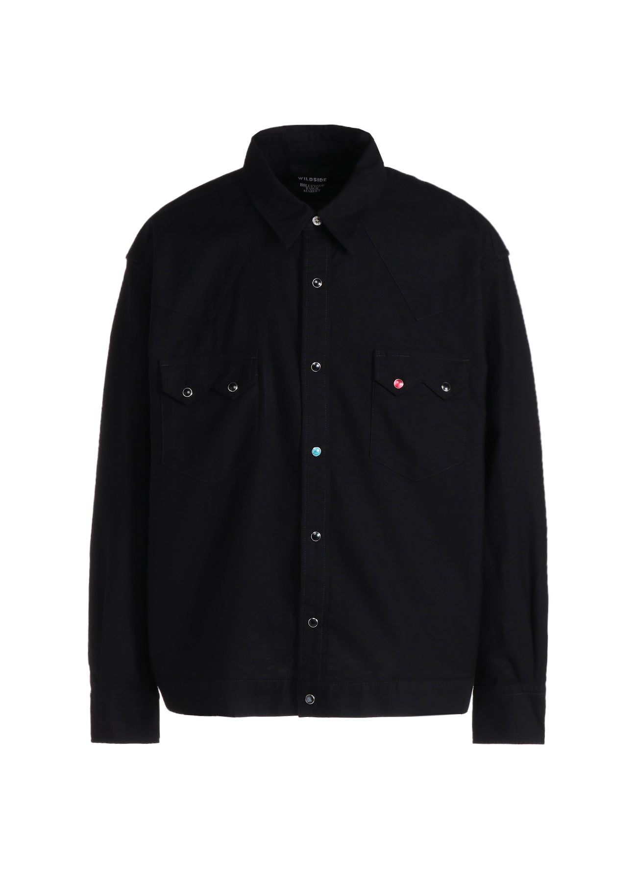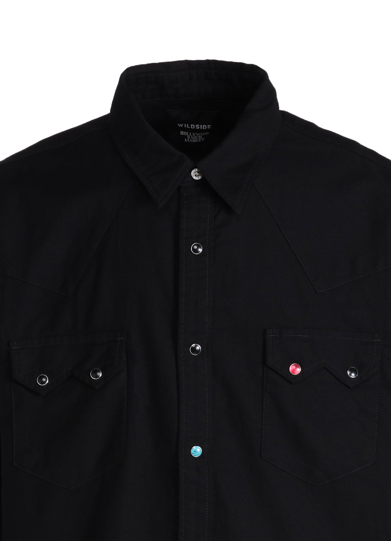 <HOLLYWOOD RANCH MARKET>のロングセラーアイテムであるTシャツ「ストレッチフライスシリーズ」からリラックス感のあるシルエットの「コンフォータブルフィット」をベースにし、黒色の生地を特注して仕立てたショートスリーブTシャツは、生地を厚手にしボリューム感を出しながらも、滑らかな肌触りを追求しました。また、ウエスタンシャツジャケットは、<HOLLYWOOD RANCH MARKET>の定番ウエスタンシャツと50年代のヴィンテージデニムジャケットのディテールを掛け合わせ、WILDSIDEの黒で表現しました。フロントやサイドアジャスターに配された黒のドットボタンの中に、ターコイズやレッドのドットボタンを取り付けたユニークな配色がアクセントとなっています。