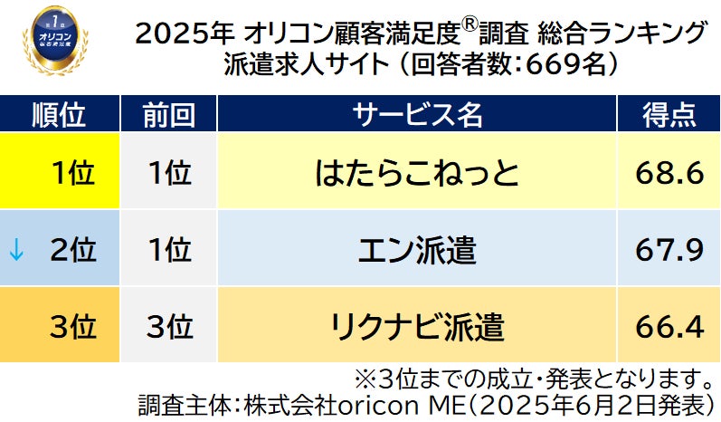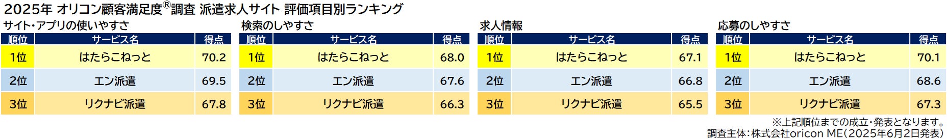 過去3年以内に派遣求人サイトに掲載された求人に応募し、派遣社員(紹介予定派遣含む)として就業した経験のある全国20~69歳の男女669人を対象とした今回の調査では、【はたらこねっと】が3年連続で総合1位を獲得しました。