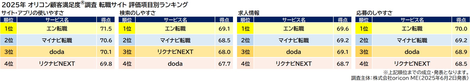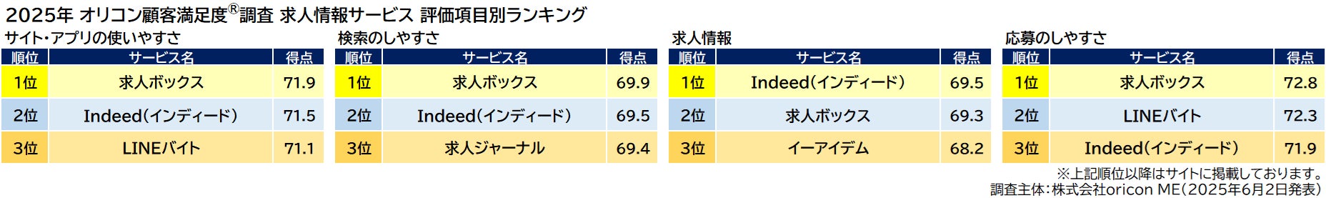 評価項目別では、「サイト・アプリの使いやすさ」「検索のしやすさ」「求人情報」「応募のしやすさ」の全4項目で1位となりました。