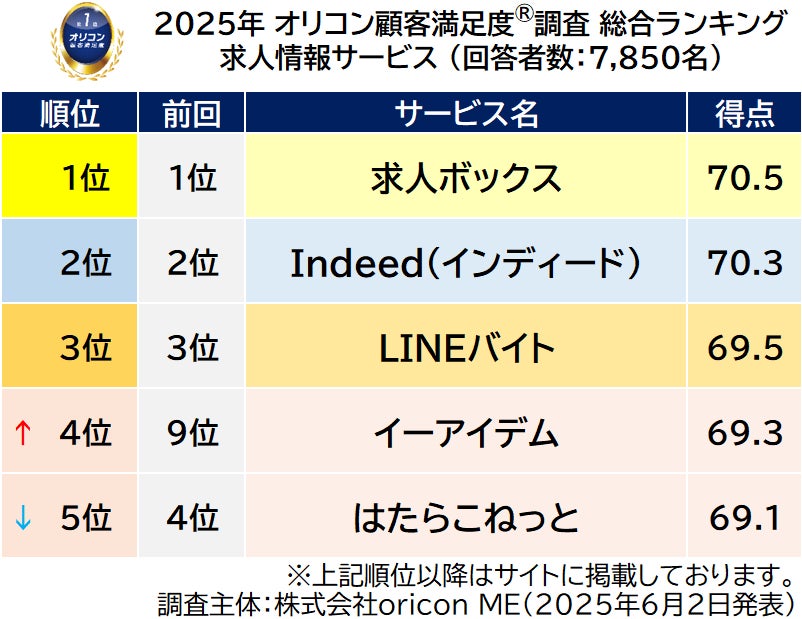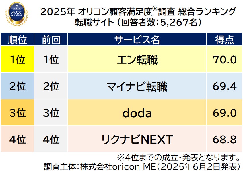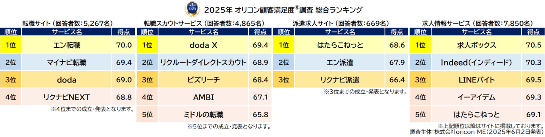オリコン株式会社(本社:東京都港区 代表取締役社長:小池 恒、略称:オリコン)は、グループ会社である株式会社oricon MEが、実際のサービス利用者を対象に第三者の立場で実施した『転職サイト』『転職スカウトサービス』『派遣求人サイト』『求人情報サービス』の顧客満足度調査の結果を、2025年6月2日(月)14時に「オリコン顧客満足度®」公式サイト内にて発表いたしました。ランキング結果は、下記の通りとなりました。