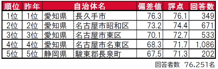 1位は、昨年と同じく愛知県長久手市で、偏差値76.3の高い評価となっています。2位の名古屋市昭和区、3位の名古屋市東区も偏差値70台で、こちらも3年連続で安定した高い評価を得ています。
