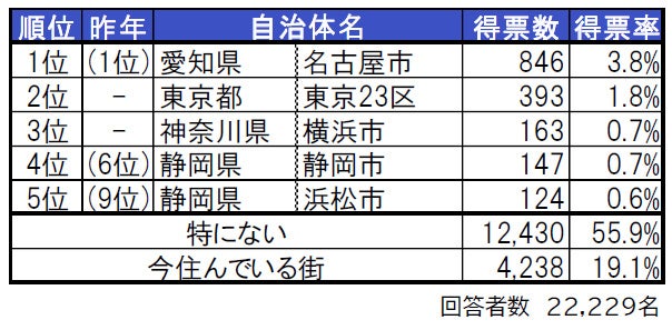 昨年は名古屋市・静岡市・浜松市の行政区を分けて集計していましたが、今年は一つの自治体としてまとめて集計したため、1位愛知県名古屋市、4位静岡県静岡市、5位静岡県浜松市となっています。また、昨年は東海内の自治体のみを対象として集計していましたが、今年は全国の自治体を対象としたため、2位に東京23区、3位には神奈川県横浜市がランクインする結果となっています。
