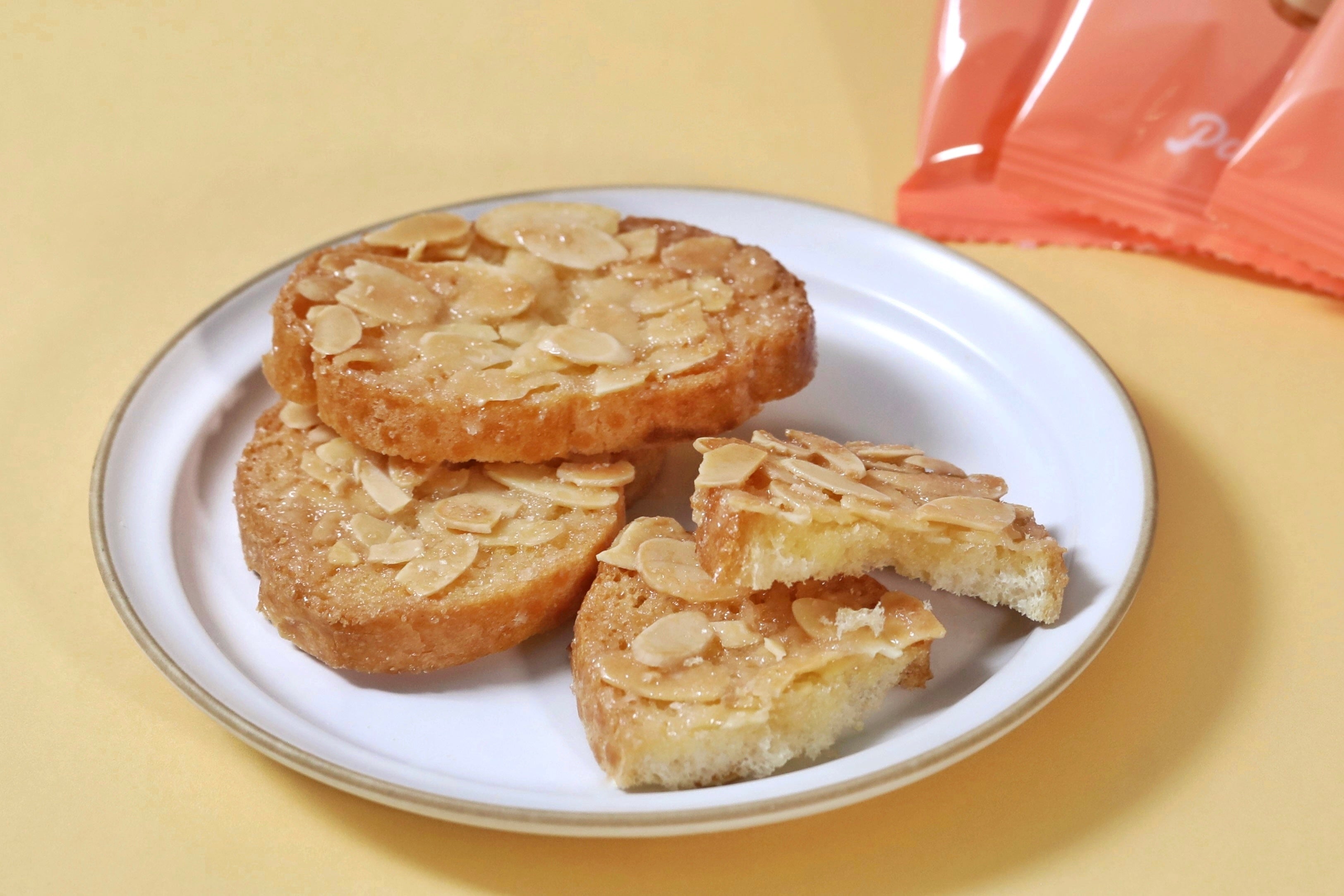 フランスパンの上に、キャラメルとアーモンドを重ねてフロランタン風に仕上げました。カリっと香ばしく焼き上げたラスクです。