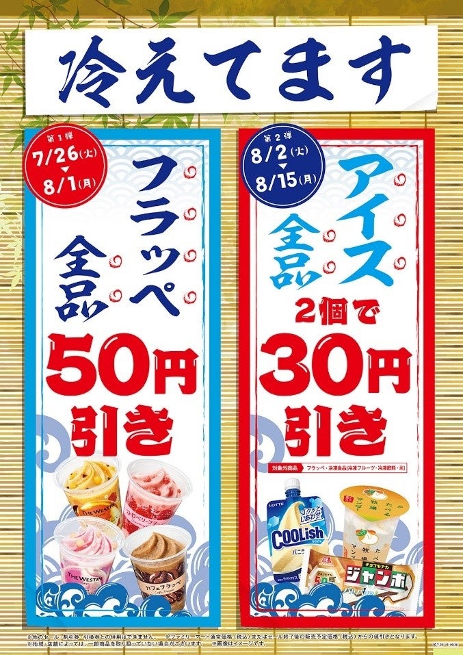 夏真っ盛りの7月下旬から、フラッペとアイスの全品割引キャンペーンを開催いたします。フラッペは全品50円引き、アイスは2個ご購入いただくと30円引きとなります。ぜひこの機会に、ファミマのフラッペとアイスで暑い夏を乗り切りましょう!