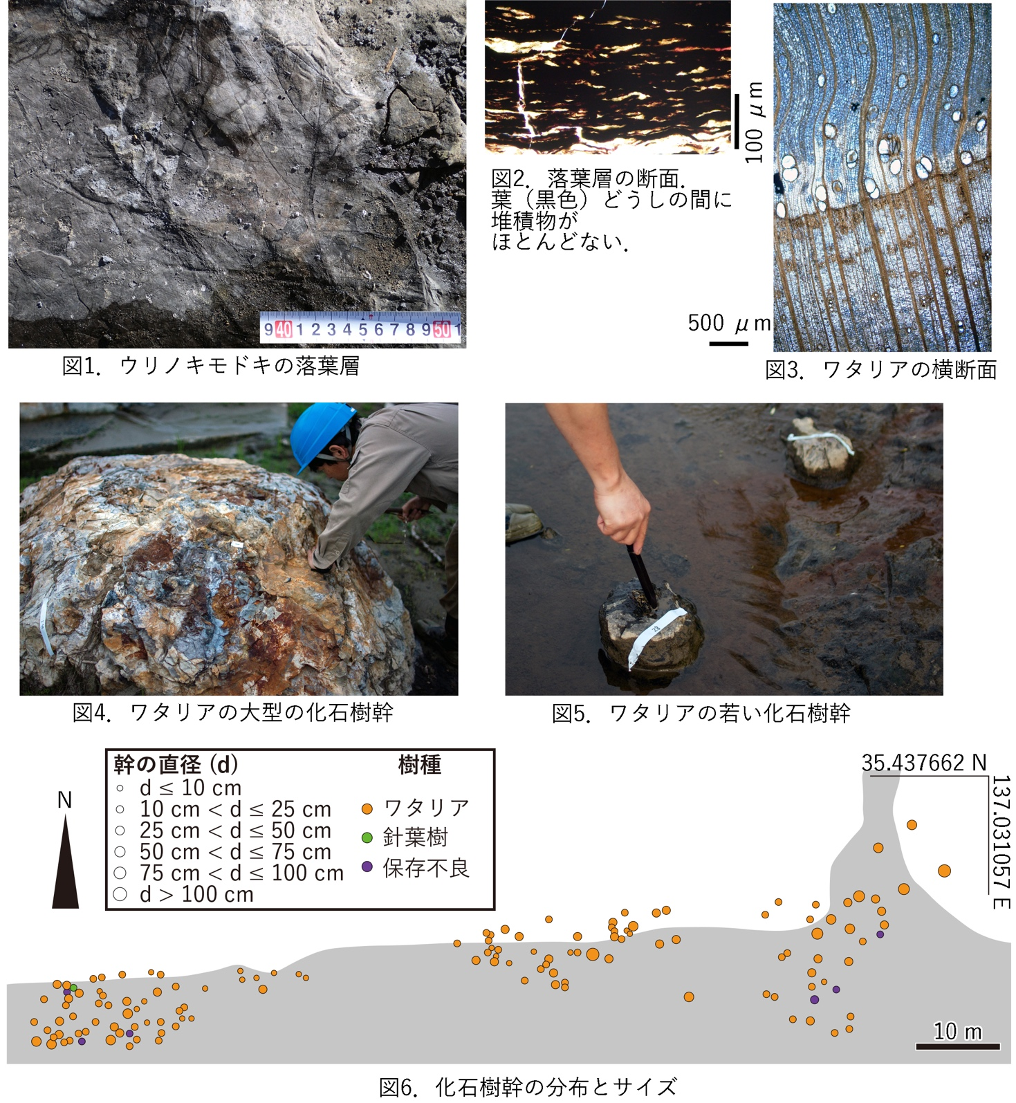 調べた約130本の樹幹化石は、すべてワタリアであることが分かりました(図3–6)。樹幹の中には直径が1mを超えるものがあった一方(図4、6)、その多くは直径が20 cm以下の若い木でした(図5、6)。つまり、化石林公園に見られる化石林はワタリアの純林であり、この純林が長期にわたって維持されていたことが分かります。また、根元に見られた葉化石の98%はウリノキモドキであること、ウリノキモドキの化石には水によって運搬された形跡がないこと(図2)、が分かりました。このことは、この化石層がウリノキモドキだけからなる落葉層であることを意味します。