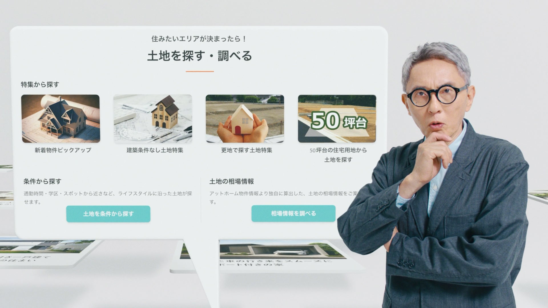 「不動産情報サイト アットホーム」の世界の中に「ウォーリー」とともに現れた松重さんは注文住宅のページに降り立ちます。注文住宅の建築事例や、「土地を探す・調べる」ページを松重さんがじっと見つめ、ついにお気に入りの一軒を見つけます。「ウォーリー」と松重さんの2ショットは必見です。