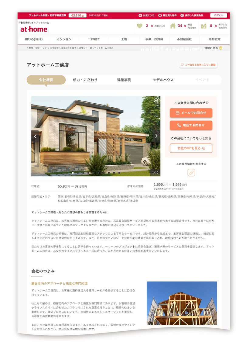 注文住宅を検討するユーザーが、建てたいエリアや建築事例などの条件を指定することで希望にマッチする住宅メーカー・工務店を検索できるコンテンツです。「建築事例」や「モデルハウス」、「イベント情報」など住宅メーカー・工務店に関する情報を多数掲載しています。また、不動産ポータルサイトで最大級の土地公開数を誇る「不動産情報サイト アットホーム」の「土地情報検索」からも遷移できるため、土地を探しながら住宅メーカー・工務店を検索することが可能です。