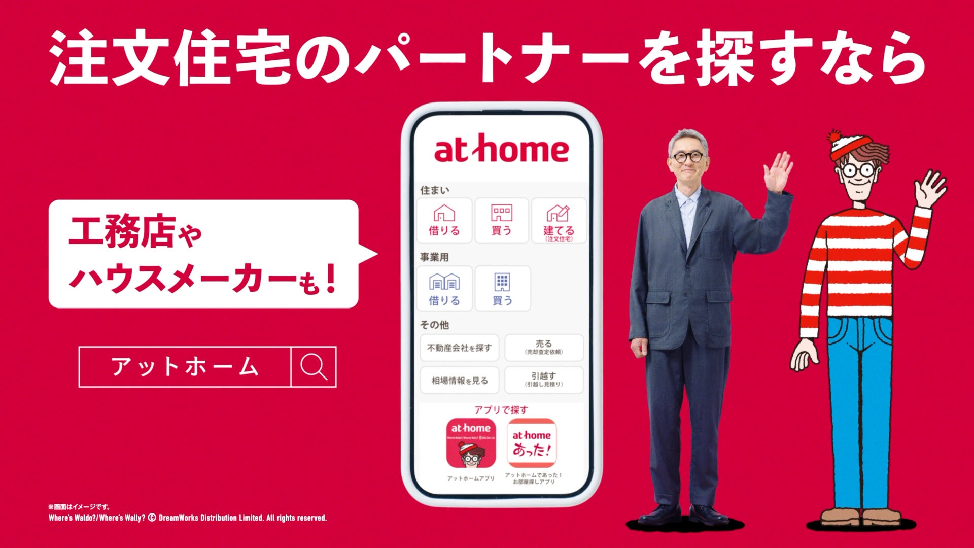 本CMでは、アットホームのCMでお馴染みの『ウォーリーをさがせ!』の「ウォーリー」と松重さんが共演。「不動産情報サイト アットホーム」の世界の中に現れ、理想が詰まった注文住宅を探します。土地や建築事例、工務店やハウスメーカーなど、注文住宅のパートナー探しが「不動産情報サイト アットホーム」でできることを伝えています。