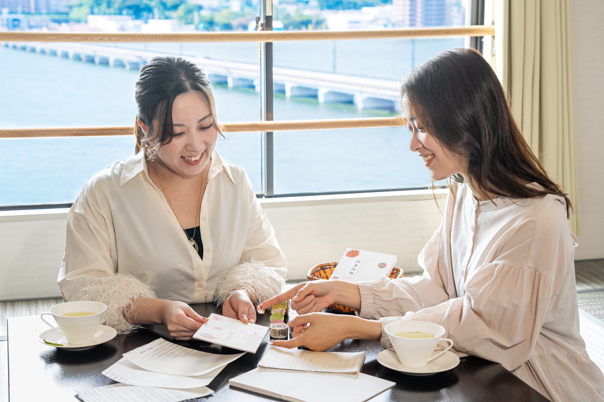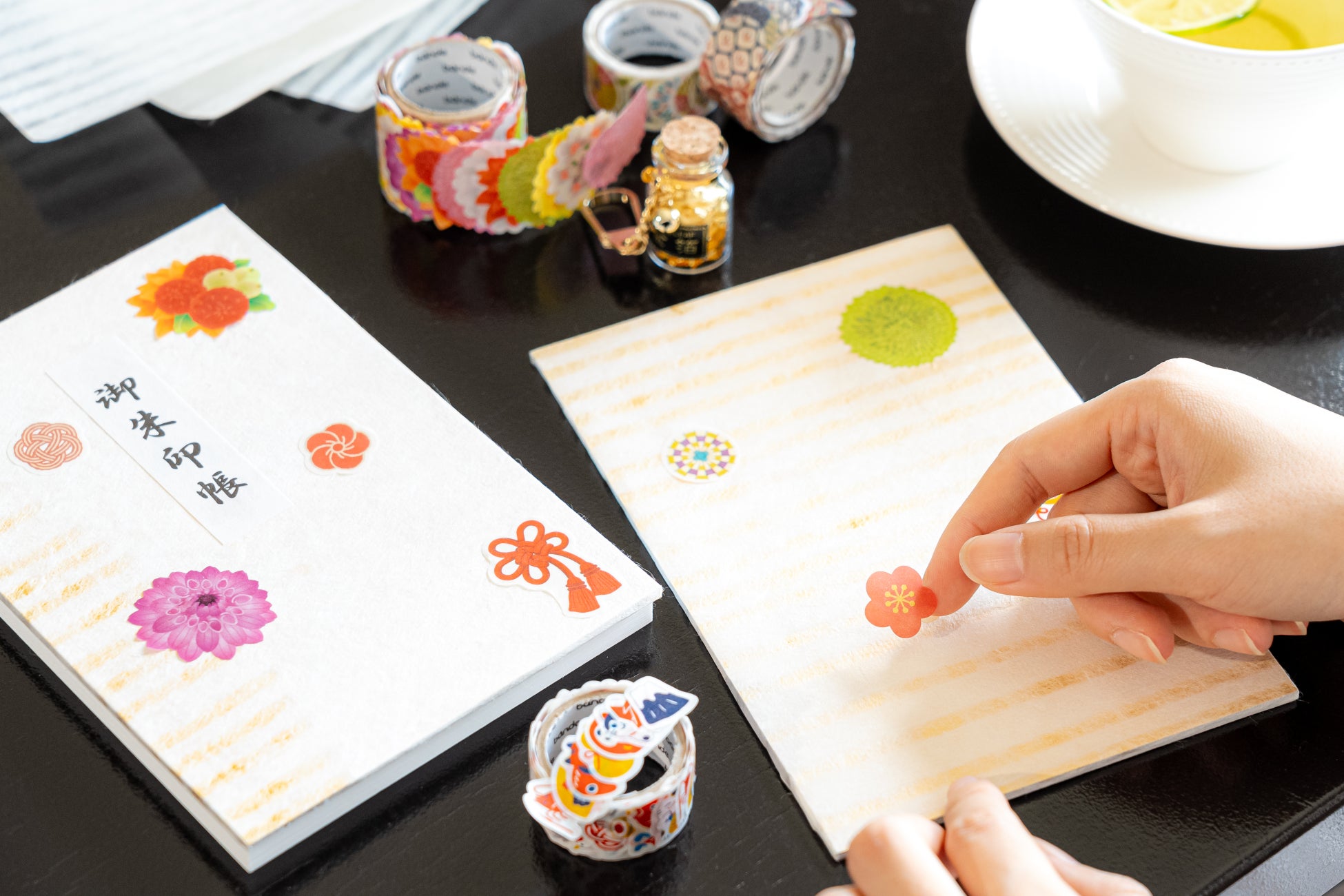 16:00 客室にてからつ茶でほっと一息、オリジナル御朱印帳づくりへ