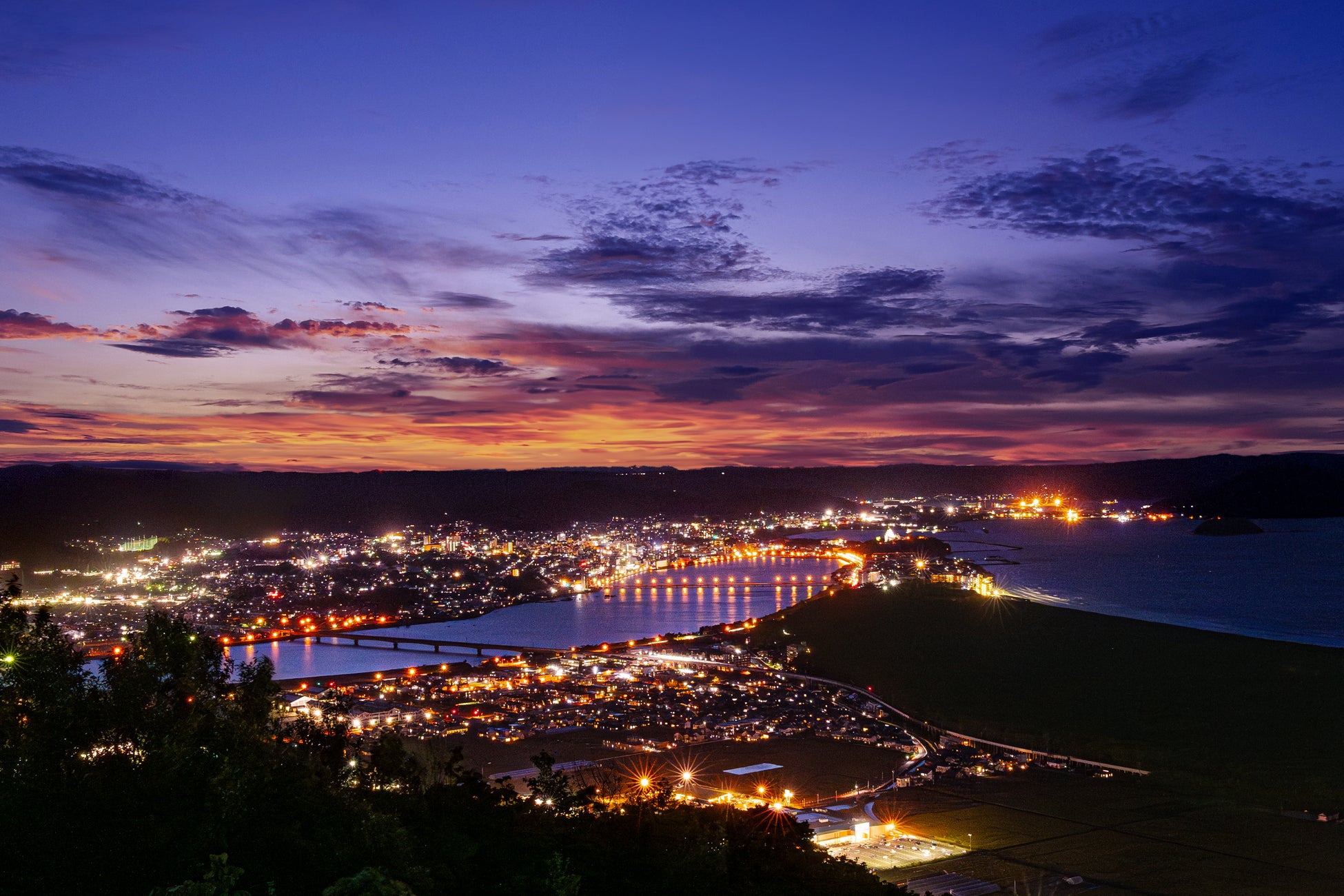 18:00 「鏡山展望台」で虹の松原と唐津湾に沈む夕陽を眺める
