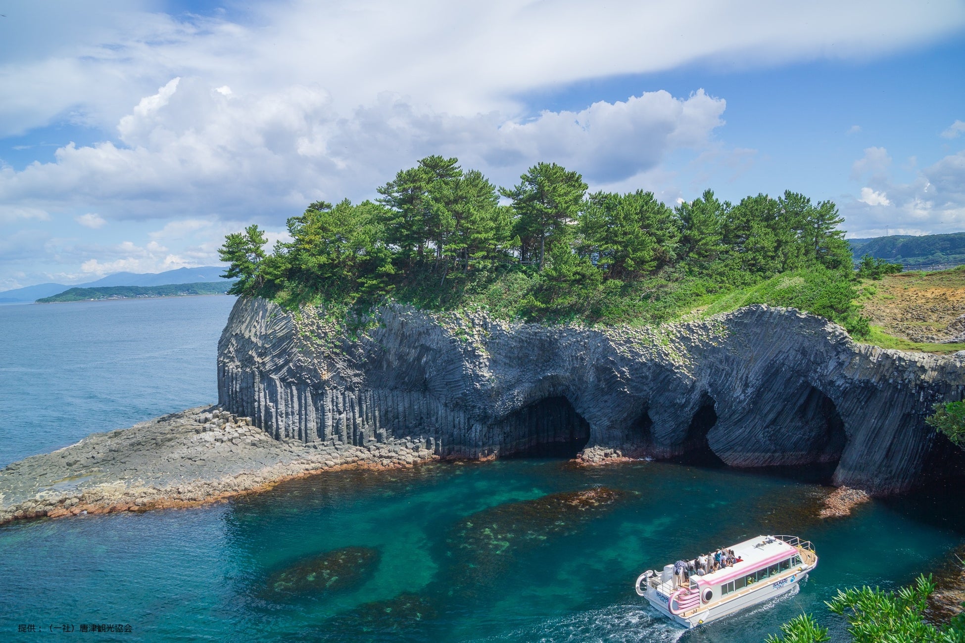 玄界灘の荒波がつくり出した国の天然記念物「七ツ釜」は、玄武岩の断崖に大小7つの海蝕洞(かいしょくどう)(*)が並ぶ絶景スポットです。遊覧船から間近に見る光景は迫力があり、青く澄んだ海とのコントラストが神秘的です。古来より自然信仰の対象ともされ、特に「魔除け」「海上安全」のご利益があると伝えられています。大自然の力強さを感じながら、浄化や心身を整えるパワースポットとしても人気です。
