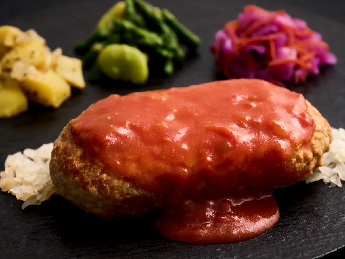 酸味のあるトマトソースに負けないように、お肉の濃厚な味わいを楽しんでいただきたく、牛肉と豚肉を使用しました。またソースが馴染みやすいように、粗びきに仕上げています。大きなハンバーグは一口ごとに噛みごたえがあり、溢れ出たジューシーな牛肉の旨味とトマトソースの甘酸っぱさのコラボレーションをお楽しみいただけます。