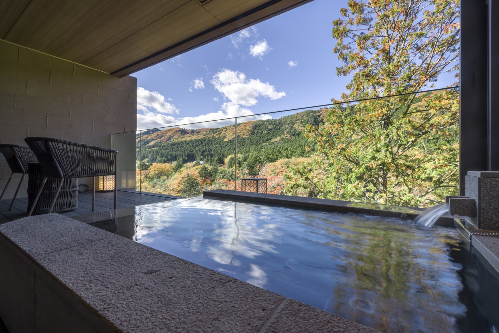 本ホテルの全客室に自家源泉の温泉露天風呂が付いており、眼下には鬼怒川渓谷の自然が広がります。鬼怒川のせせらぎ、渓谷を吹き抜ける爽やかな風とともに、風景美と温泉の両方をプライベートに楽しみながら、ゆったりとした自分時間をお過ごしいただけます。また、地産地消や環境への配慮、サステナブル・リゾートホテルとして、建材は地元北関東から東北エリアの国産石材をふんだんに使用し、消費電力はすべて再生可能エネルギー由来でまかなっています。レストラン「炅(けい)」では、ガスを使用せず薪火の力で調理をした、ジャンルに捉われない薪火料理をご提供いたします。その他、レストランオリジナルのスイーツや発酵食品、地域の魅力的な商品を取り扱うSHOP「会(かい)」、屋外での Wi-Fi環境の整備や モニター付きのテレワークブースを完備しワーケーションにも対応するなど、多彩な共用施設も魅力です。
