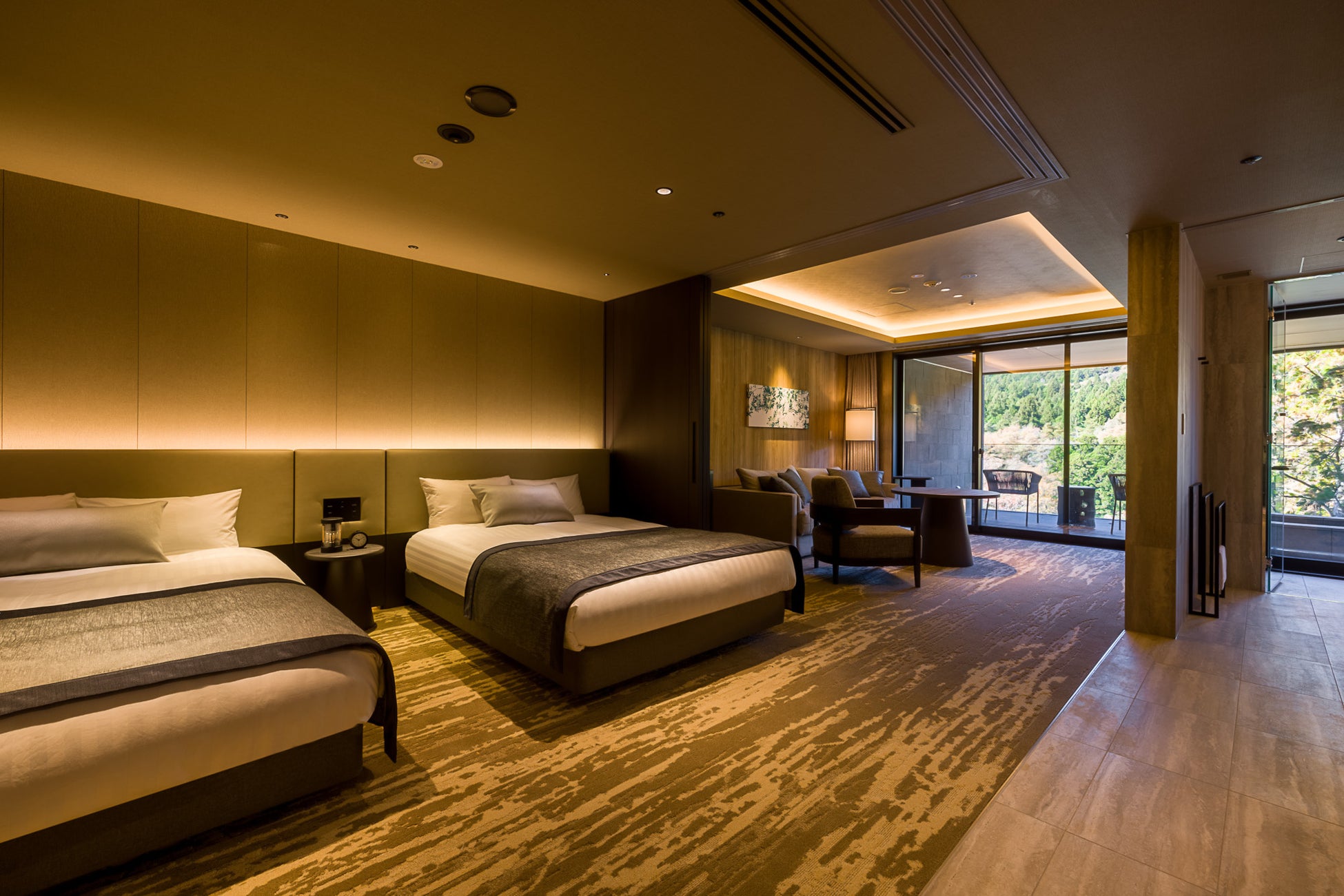 本ホテルは、一般のお客様にご宿泊いただける 10 室と会員制ホテル「東急ハーヴェストクラブVIALA鬼怒川渓翠」 48 室の全 58 室の客室で構成されています。客室は、59 ㎡~ 76 ㎡と広々とした居室空間となっており、洋室または和洋室タイプからお選びいただけます。