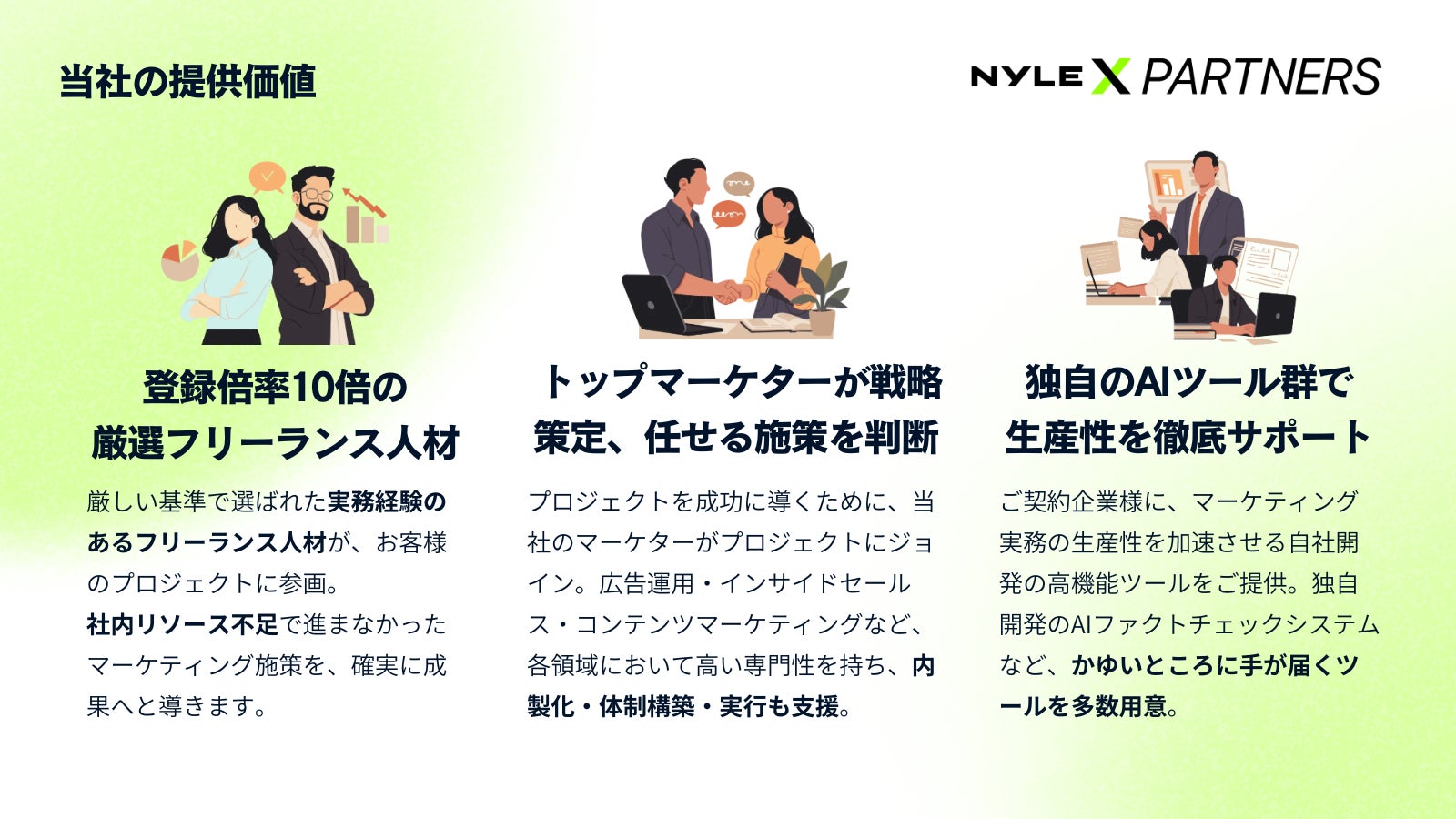 このような“実行力の枯渇”という社会的課題に対し、ナイル株式会社(所在地:東京都品川区、代表取締役社長:高橋飛翔)は、コンサルティングとプロフェッショナル人材の力を掛け合わせたマーケティング実行支援サービス「Nyle X Partners(ナイル イクスパートナーズ)」(https://x.seohacks.net/) の提供を2025年11月より開始いたします。