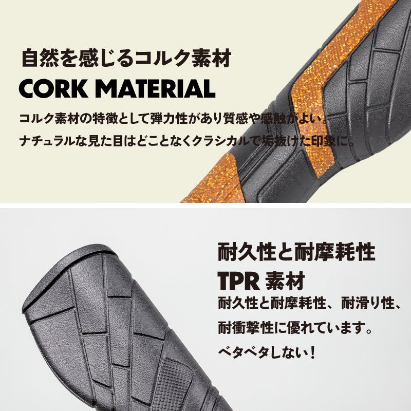 ゴムと柔らかいコルク素材を組み合わせ、二重密度による高グリップ性を提供します。