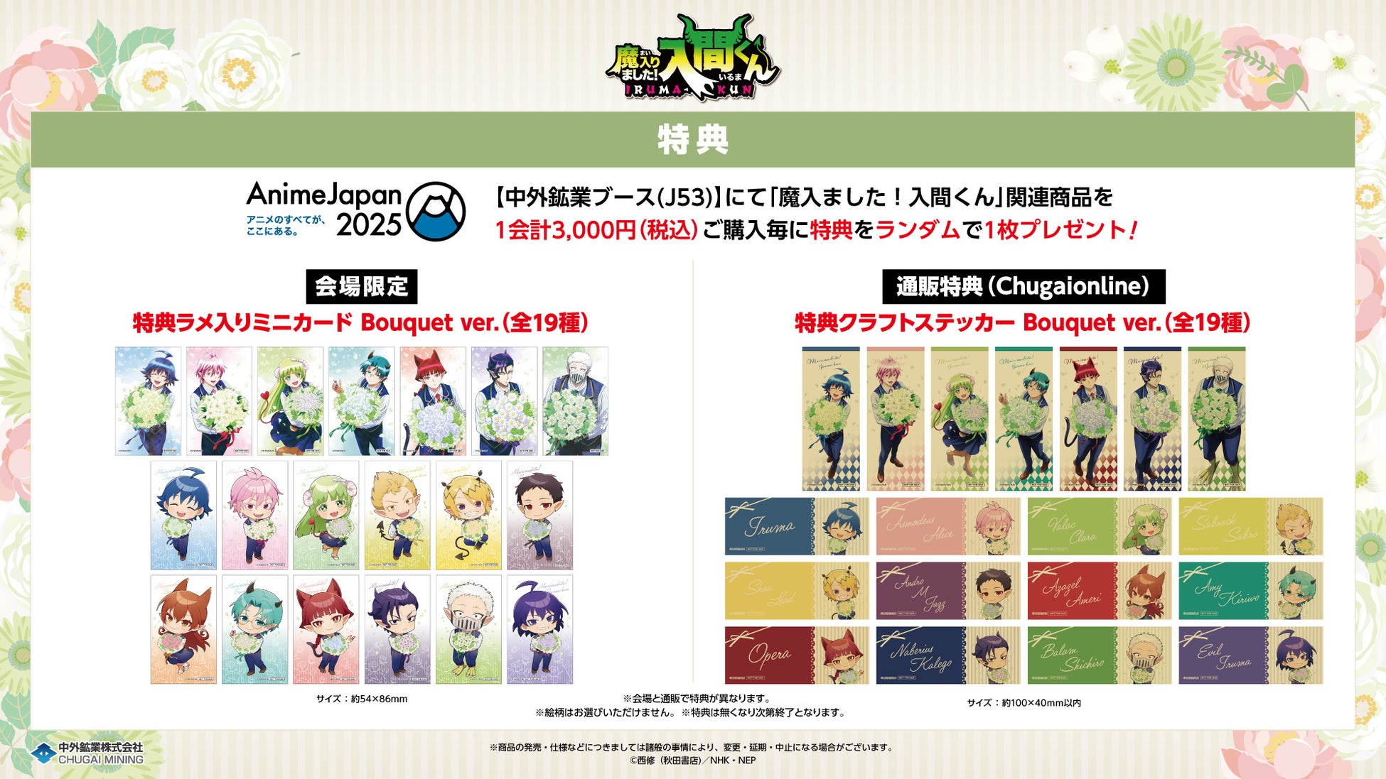 中外鉱業ブースにてアニメ『魔入りました!入間くん』AnimeJapan 2025関連商品を1会計3,000円(税込)ご購入毎に、ラメ入りミニカード (全19種)をランダムで1枚お渡しいたします!