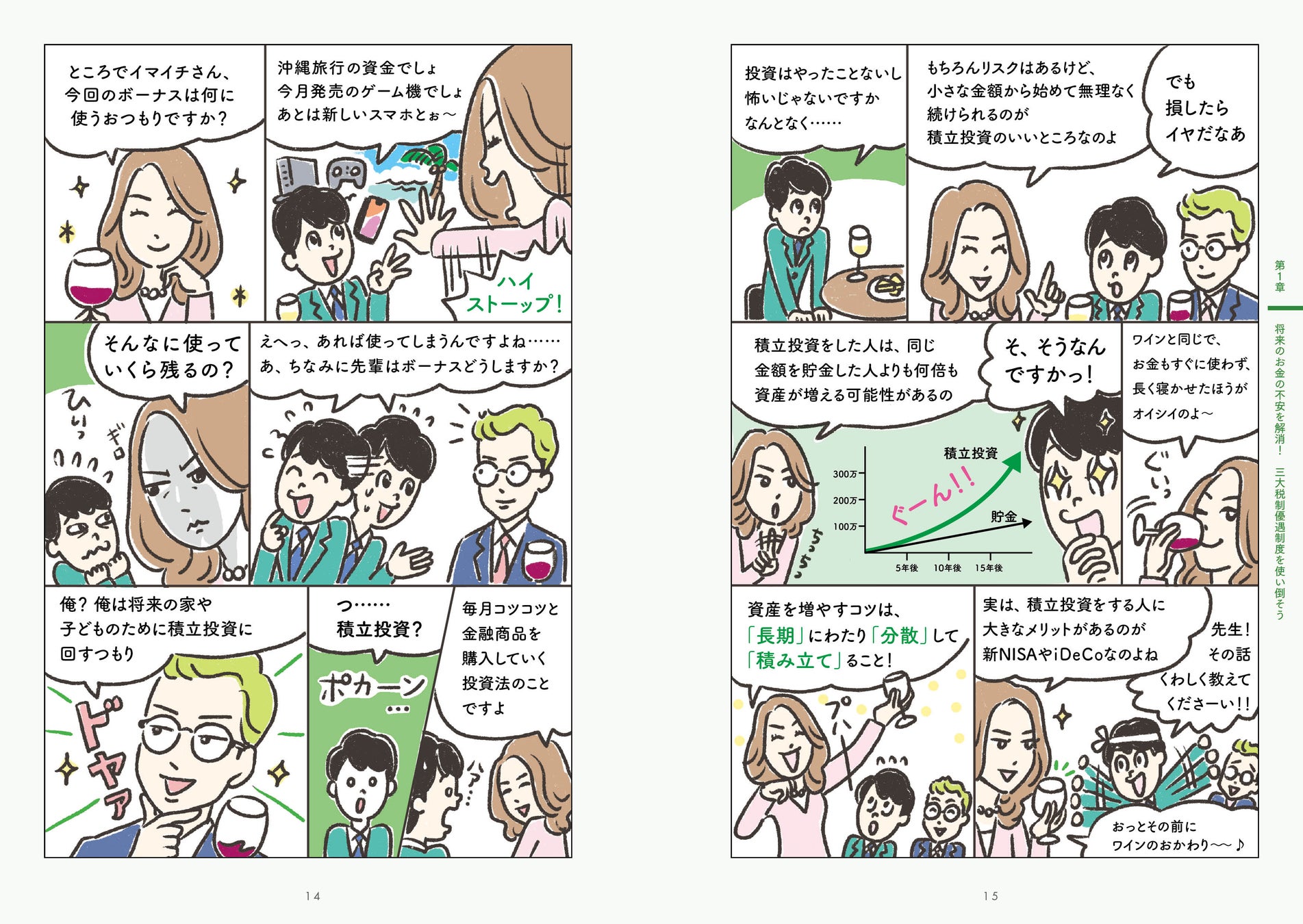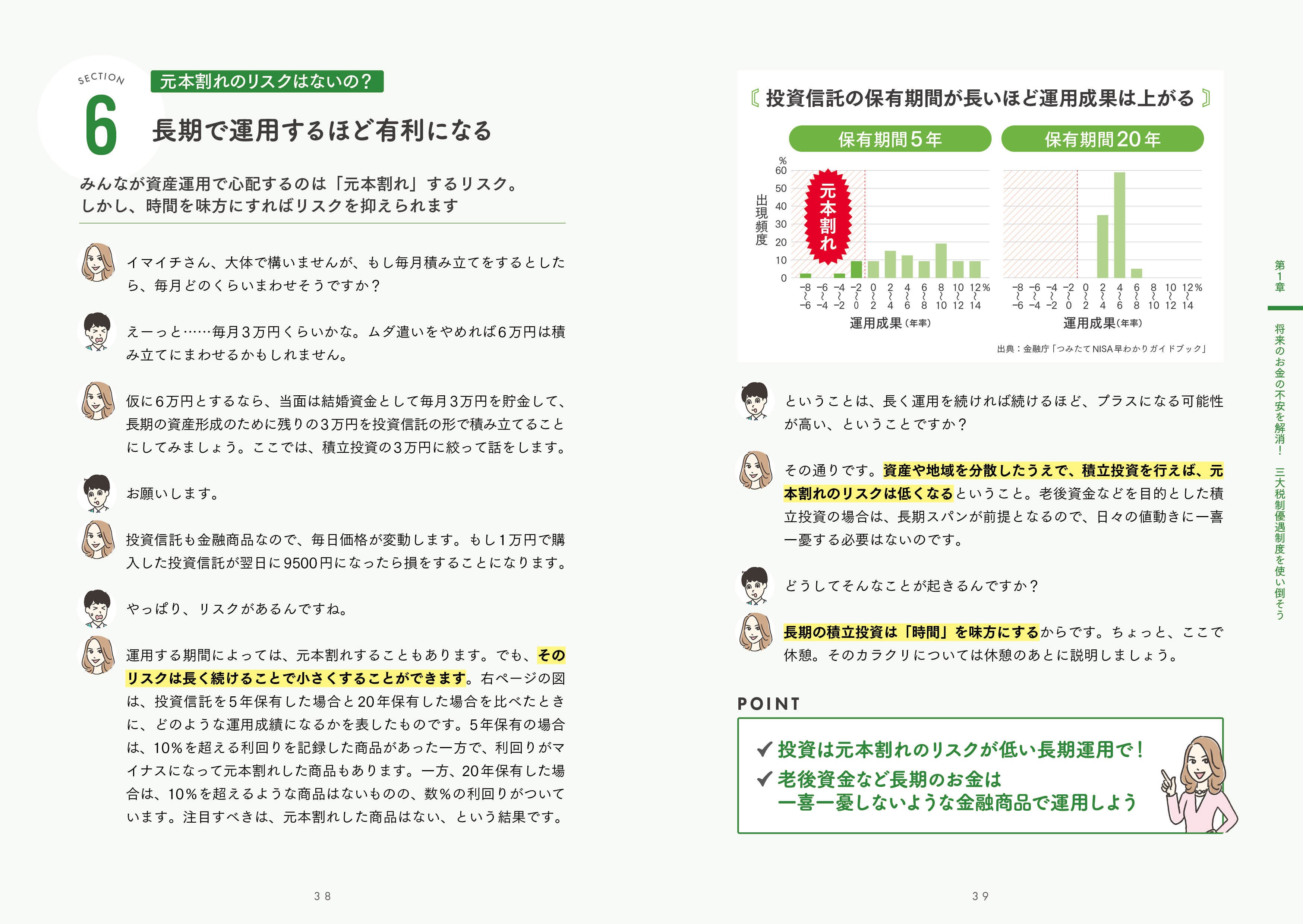 会話形式の本文と図を読むだけで、「投資についていまさら聞けない事」「NISAのはじめ方」[iDeCoって何?」「ふるさと納税はどこがお得なの??」が理解できるようになっています。
