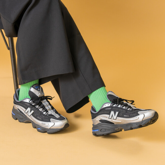 モノトーンのスニーカーにソックスの色でアクセントをつけると、遊び心あるシティースタイルに。反対色と合わせると