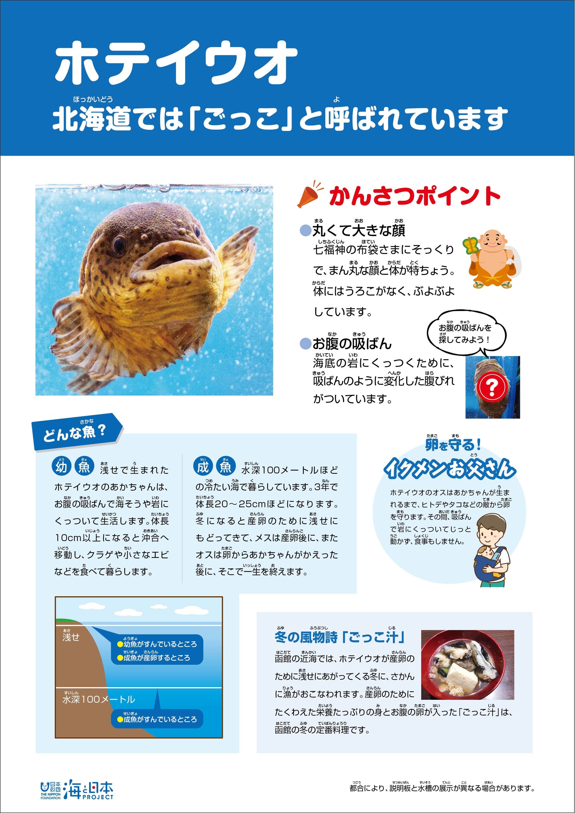 「食を通じて海を学ぼう」をテーマにおこなってきた今年度展示の最終リニューアルでは、函館の冬を代表する魚、ホテイウオを親子で紹介。地元では「ごっこ」の呼び名で親しまれている魚で、その身と卵を入れた郷土料理「ごっこ汁」は冬の風物詩です。函館朝市ミニ水族館では、2021年4月に北海道大学臼尻水産実験所で生まれた体長2cmほどの幼魚と、函館近海で捕獲された成魚を展示します。普段あまり見る機会がない、生きたホテイウオの成魚と幼魚を、間近で見比べることができる機会を提供します。