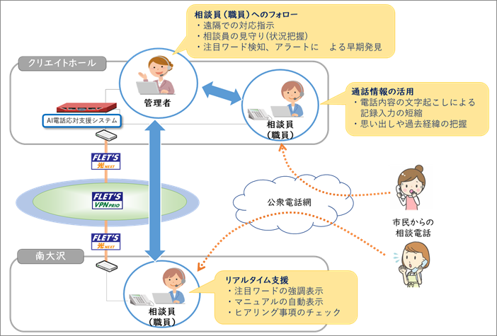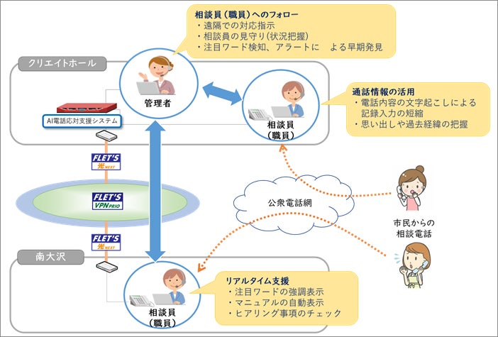 そうした課題に対し、AI電話応対支援システムを児童虐待対応業務に活用し、応対する職員のスキル向上と対応の標準化、遠隔での相談員の見守りの実現に向けた実証実験を行います。
